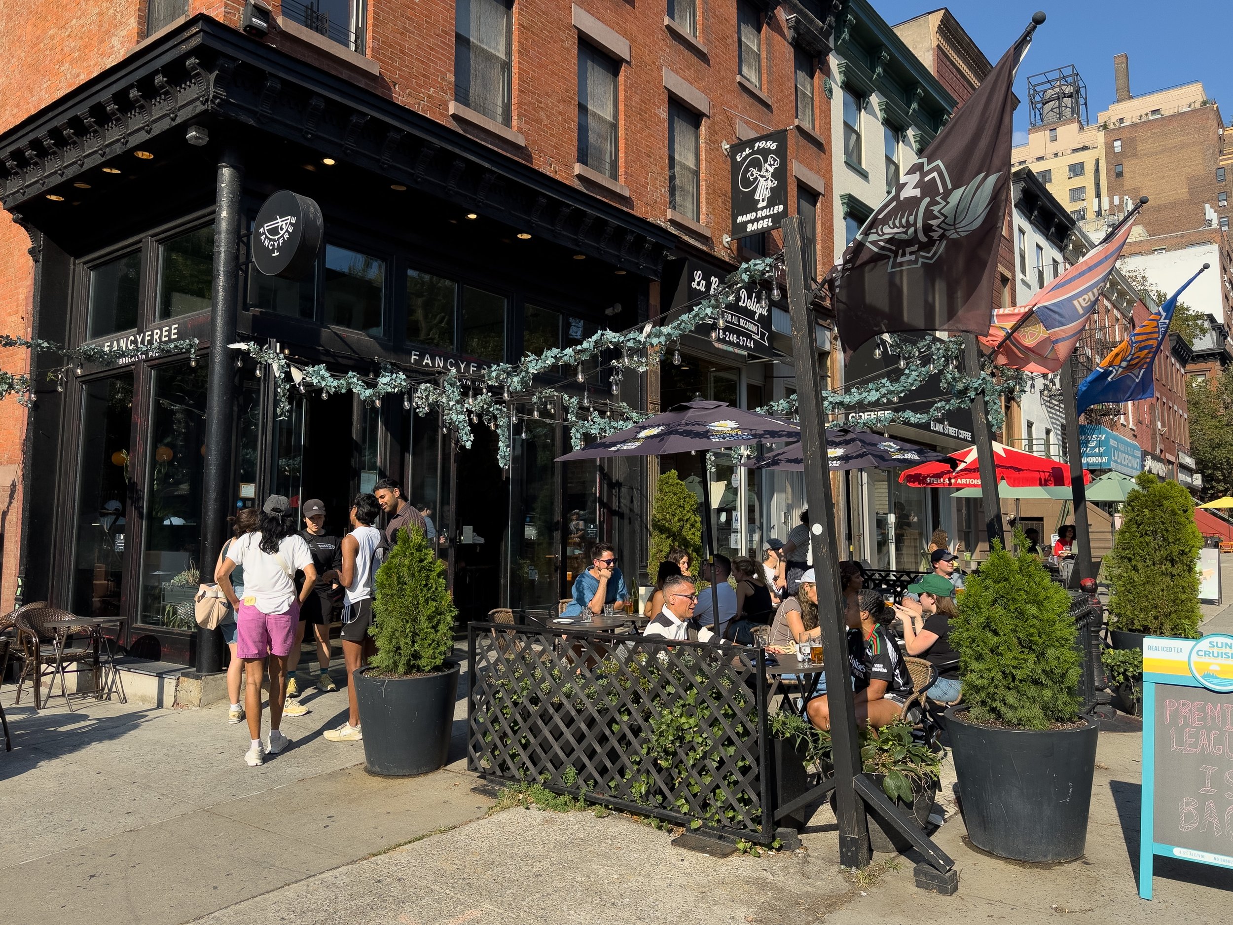 Coffee functions as neighborhood infrastructure rather than destination culture. Spots such as The Center for Fiction Café & Bar, Moka & Co, Bittersweet, Kofee, Hungry Ghost, Coffee Project, Blank Street, Compilation Coffee Roasters, and La Bicyclette Bakery support daily routines, remote work, and casual meetings without dominating the streetscape.